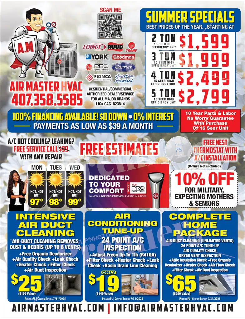 AirMasterHVAC Servicing Orlando And Surrounding Areas. We strive on our customer service making sure all our customer are 100% satisfied with the service they have requested from us. We specailize A/C Repair & Installation,New Air Duct Systems & Duct Cleaning, Attic Insullation & Water Damage. We have technicians that are licensed and insured for any services you require on call round the clock. Do not hesitate to give us a call with any of your needs or questions.