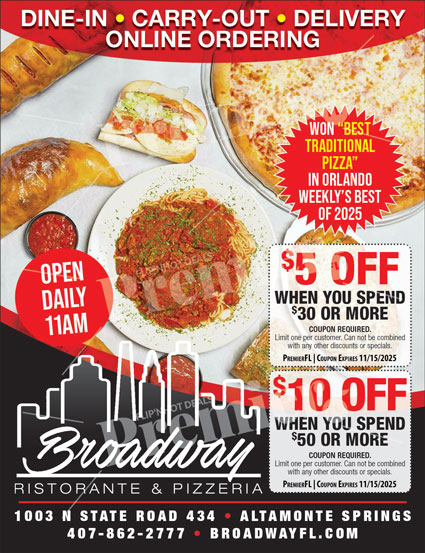 Voted “Best Traditional Pizza” in Orlando Weekly’s Best of 2025, Broadway combines classic recipes with quality ingredients for the perfect slice every time. Open daily for dine-in, carry-out, and delivery.