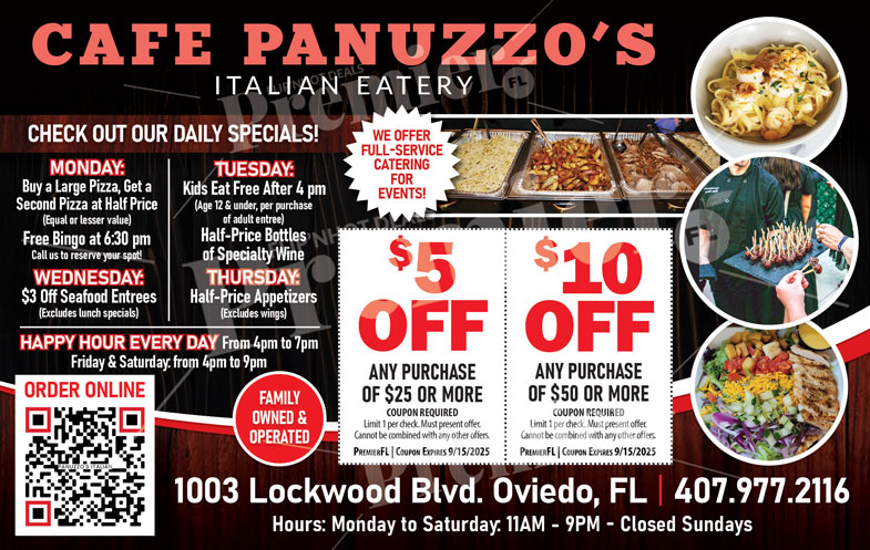 Cafe Panuzzoโs Italian Eatery offers authentic Italian cuisine, including pasta dishes, pizzas, and a variety of traditional Italian entrees.