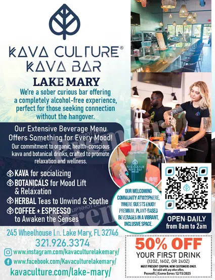Located in Lake Mary, Kava Culture Kava Bar serves as a community hub where guests can gather, connect, and recharge in an inclusive, laid-back setting. Open daily with extended hours, it’s perfect for morning focus, afternoon relaxation, or evening socializing—without the hangover.