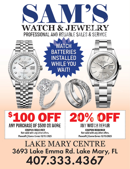 Located at Lake Mary Centre, Samโ€™s Watch & Jewelry is ideal for shoppers seeking professional service, fair pricing, and a local jeweler they can trust. Whether youโ€™re purchasing a gift, upgrading a timepiece, or maintaining your jewelry collection, Samโ€™s delivers quality and peace of mind with every visit.